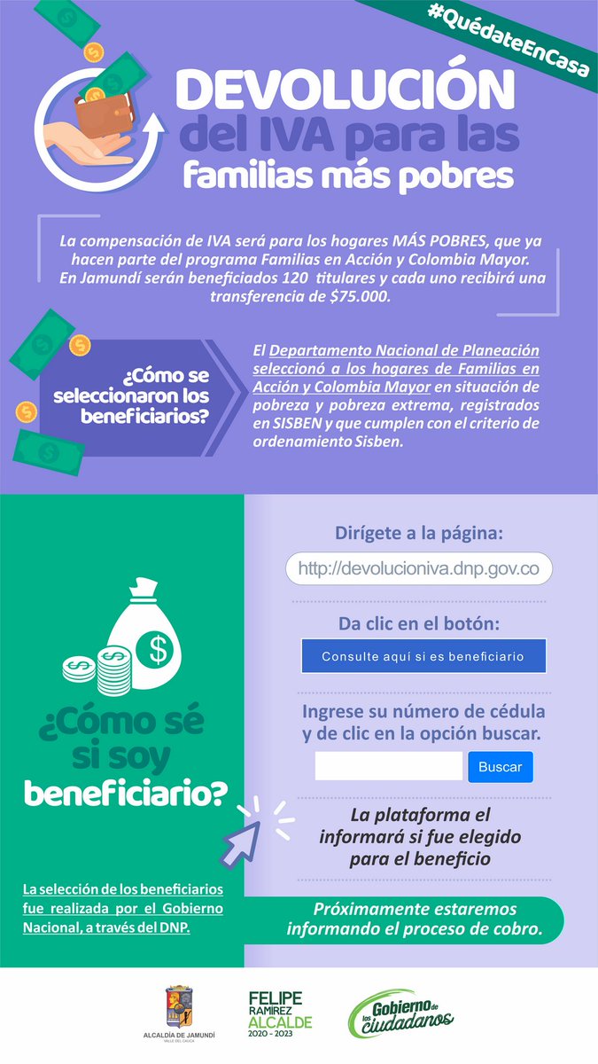 Para el proceso de cobro, los beneficiarios deben asistir a su punto de pago con tapabocas personal y no. El procedimiento para consultar si se es beneficiario de la devolución del iva en colombia es muy sencillo. A continuación, haga clic en la opción consulte aquí si es beneficiario. Pero además podrán verificar si son beneficiarios en la página devolucioniva.dnp.gov.co. Para los beneficiarios del programa familias en acción es a través de daviplata, y los de colombia mayor se entregan en cada municipio. El gobierno a implementado la devolucion del iva para las personas mas afectadas en esta crisis, consiste en que estas familias recibirán recursos provenientes de la recaudación del impuesto al valor agregado iva. Es vital que las familias que recibieron la ayuda en 2020. En el siguiente link, podrá verificar sí tiene derecho a la devolución del iva que anunció el director del dnp Los beneficiados de la devolución del iva en colombia, según estableció la ley de financiamiento, fueron seleccionados de los pero, ¿cómo estar seguro de que usted es una de las personas a las que el gobierno les devolverá el iva? Para consultar ingrese a esta página, dele clic al botón azul consulte aquí si es beneficiario, digite su número de cédula y espere el resultado. Si eres beneficiario en esa misma página te informarán del canal de desembolso del dinero. ¿dónde consultar si soy beneficiario de la devolución del iva? Según información del dnp, el carácter regresivo del iva impacta sin discriminación alguna a todas las personas, sean de ingresos altos o bajos.